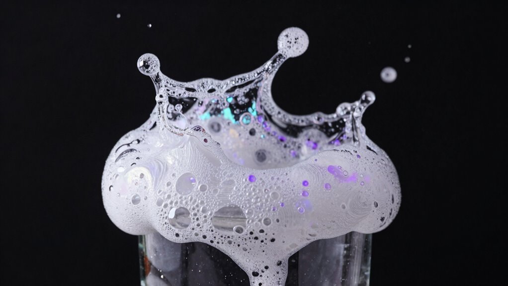 Certain materials are more prone to foaming from agitation due to their material susceptibility and surface tension properties. You’ll find that low surface tension materials, like surfactant-rich polymers, tend to foam easily because their molecules reduce the liquid’s cohesive forces. High susceptibility materials, such as certain foaming agents, also increase foam formation. Understanding these factors helps you select materials that resist foaming or control it effectively during agitation.