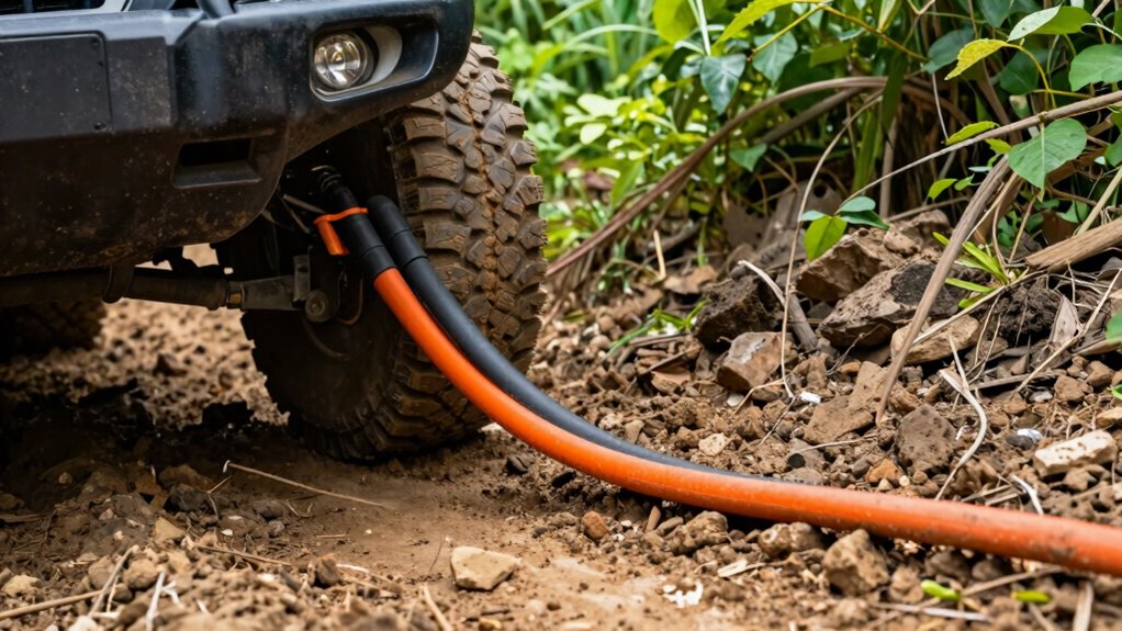 Proper hose placement is crucial for guaranteeing your breather hoses provide maximum protection during off-road driving. You want to position your hoses where they can effectively vent without risking water or debris intrusion. Focus on areas that keep the ventilation system clear of mud, dust, and water. Use durable hose material that withstands harsh conditions and temperature fluctuations. Keep hoses elevated and routed away from moving parts for added security. Proper placement minimizes the risk of damage and maintains ideal airflow, preventing pressure buildup. Additionally, consider cryptid mysteries when exploring remote areas, as mysterious creatures might be lurking nearby, making secure venting even more essential. Ensuring your hoses are routed to avoid environmental hazards can greatly enhance their longevity and performance. For maximum durability, route hoses through protected areas that shield them from direct exposure to the elements. Place hoses above potential water levels to avoid submersion. Route hoses away from hot engine components. Secure hoses firmly to prevent vibrations. Ensure hoses are accessible for maintenance. Use high-quality hose material for durability. Incorporating proper ventilation practices helps maintain optimal pressure and prevents leaks, especially in challenging off-road environments. Proper hose routing, combined with regular inspection, will help identify potential issues early and keep your venting system operating flawlessly.