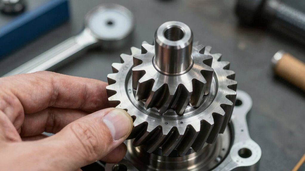 Checking your pinion preload might seem intimidating, but with the right steps, you can do it yourself and catch issues early. First, verify the vehicle is on a stable surface and securely lifted. Remove the differential cover to access the gear setup. Then, carefully rotate the pinion nut to check for resistance; this indicates the preload. Use a dial indicator to measure the pinion gear’s end-play, which should be within manufacturer specifications. Remember, proper gear lubrication is essential to prevent wear and ensure smooth operation during testing. Adequate gear lubrication helps maintain preload consistency and prevents premature wear. Additionally, ensuring the correct preload setting is vital for optimal gear contact and longevity. Proper gear contact patterns are crucial for even load distribution and avoiding gear failure. Checking for signs of gear wear during inspection can help identify potential issues before they become severe. Adjustments aren’t made yet, but verifying preload now helps identify if lubrication requirements are being met and if gear lubrication is adequate. Following these steps keeps your drivetrain healthy and prevents premature gear damage.