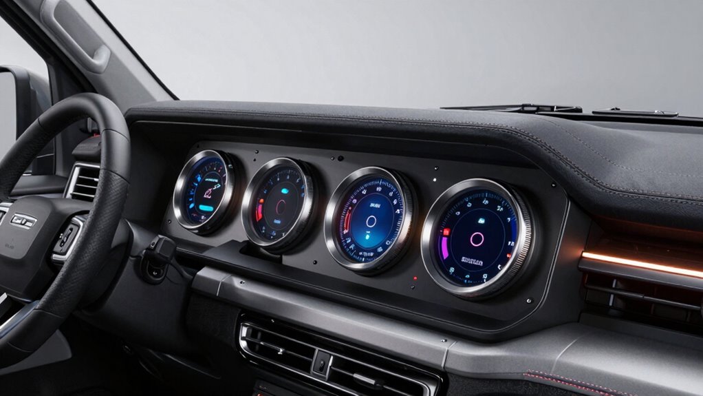 Choosing a dash mount gauge pod that fits your truck requires careful attention to compatibility factors. First, I verify that the gauge pod matches my specific truck make, model, and year to guarantee proper fitment. I also check the gauge size requirements, such as 2-1/16″ or 3-3/8″ diameters, so they align with my existing or planned gauges. The mounting method is another key consideration—whether it’s designed for dashboard, A-pillar, or hood cowl mounting—and must suit my truck’s interior layout. Additionally, I confirm that the design accommodates the dashboard’s contours to avoid installation issues. Finally, I review manufacturer specifications to guarantee the gauge pod works with aftermarket gauges and any vehicle modifications I’ve made.