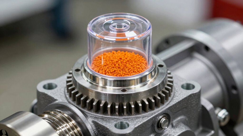 Making certain your desiccant breather operates effectively across temperature variations is crucial for peak gearbox protection. You need to verify that its operating temperature range matches or exceeds your environment’s conditions. For instance, if your equipment faces temperatures as low as -40°F (-40°C) or as high as 300°F (149°C), the breather must handle these extremes without losing moisture protection. It should also accommodate temperature fluctuations during startup and shutdown cycles, which can create pressure differentials. Additionally, check that the materials used resist thermal expansion and contraction, maintaining seals and filtration integrity. A breather designed for a broad temperature range ensures consistent performance, preventing moisture ingress and safeguarding your gearbox against temperature-related issues.