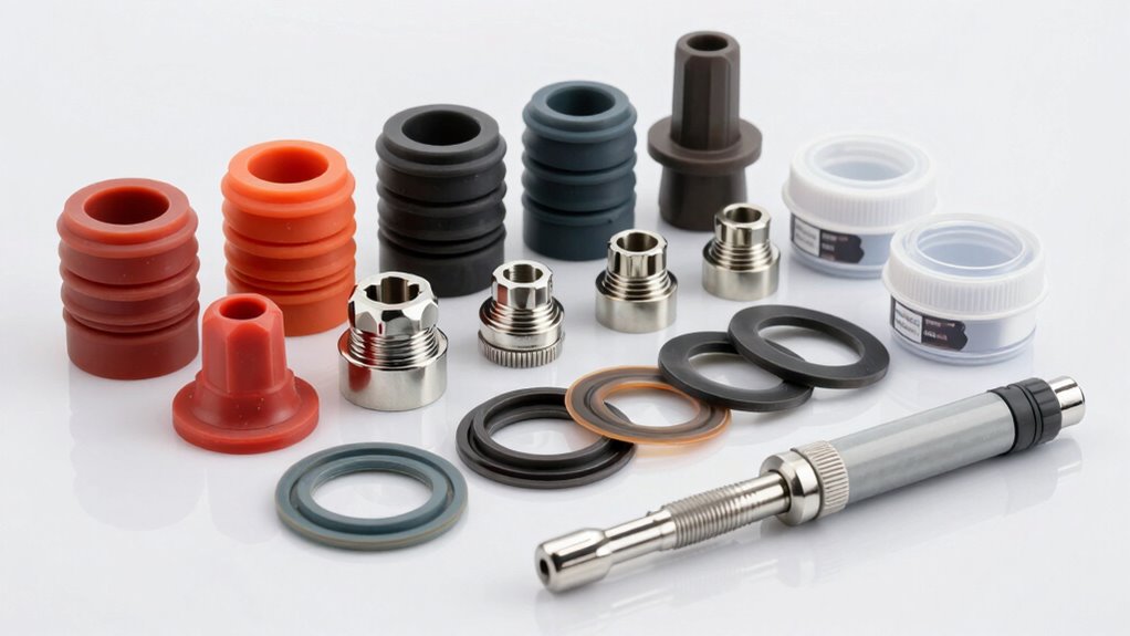 Imagine opening your gasket kit and seeing a mix of rubber, cork, and metal gaskets. Yes, you can combine different materials in one kit. Each material suits specific vehicles and conditions, so blending them ensures you’re prepared for various situations. Just make certain to match the gasket material with your vehicle’s specifications. This way, you’ll keep your engine sealed tight and running smoothly, no matter what.