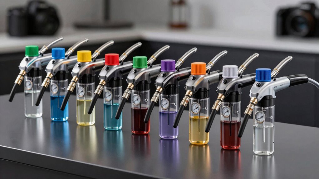 Selecting a pressure bleeder system with sturdy materials is essential for reliable performance and long-lasting use. I look for corrosion-resistant metals like aluminum, brass, and stainless steel because they withstand exposure to coolant and other automotive fluids. High-quality rubber and nylon components are crucial for hoses, seals, and O-rings, especially under high pressure, ensuring they won’t crack or degrade prematurely. Shockproof and impact-resistant materials in gauges and fittings help the system endure accidental drops and frequent use. Reinforced joints and fittings reduce leaks and material fatigue over time. Durability also depends on the ability to resist temperature fluctuations and chemical exposure. Choosing a system with these durable materials guarantees longevity, consistent performance, and fewer maintenance worries.
