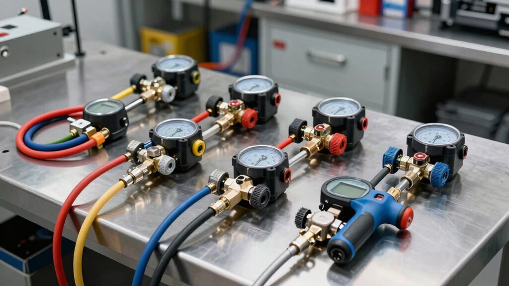 Think of a portable pressure test kit as a trusted compass in the wilderness—compact, reliable, and ready when you need it most. Yes, there are several lightweight, field-ready kits designed for on-site use. These kits are perfect for quick diagnostics, allowing me to check sealed gearboxes without lugging around bulky equipment. They’re essential tools that make fieldwork more efficient, ensuring I can assess pressure integrity anytime, anywhere.