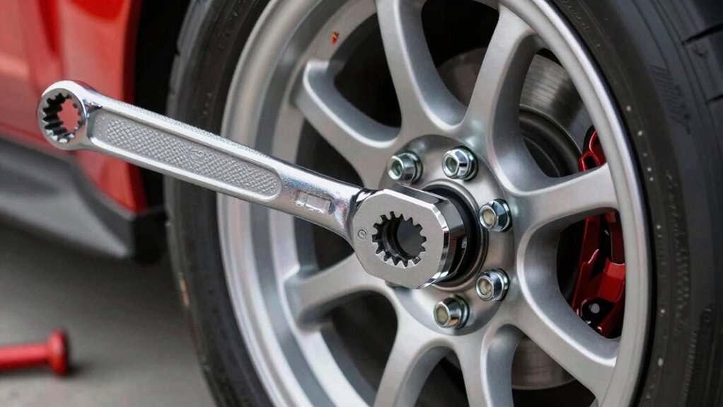 To calibrate my torque wrench accurately, I start by setting it to the desired torque. I then use a calibration device or a torque testing machine to check its reading. If it’s off, I adjust it according to the manufacturer’s instructions. I repeat this process until the wrench shows the correct torque consistently. Regular calibration guarantees I get precise, reliable results every time I work on my lug nuts.