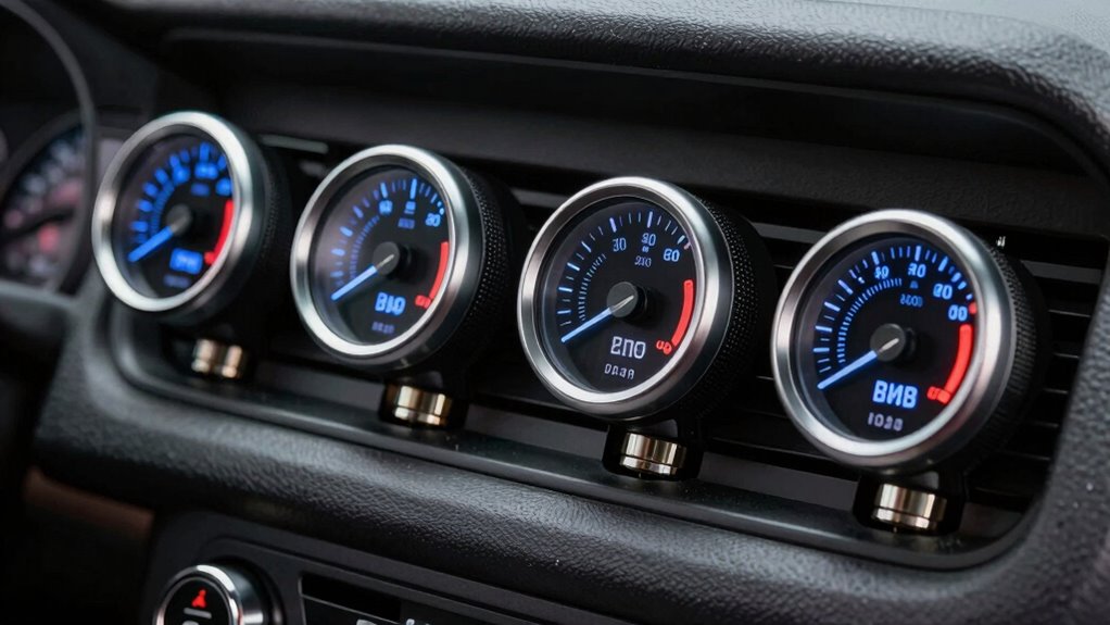 Lighting and display options play a crucial role in guaranteeing you can easily read your transfer case temperature gauge in all conditions. Many gauges offer multiple backlight colors like red, green, and blue, or customizable modes to match your vehicle’s interior or personal style. LED or incandescent lighting provides clear visibility during night drives, making it easy to monitor your transfer case temperature in low-light situations. Some models let you cycle through predefined colors or set a preferred hue, adding a personal touch. Brightness adjustments, often via dimmer controls or wiring to your vehicle’s headlight switch, help prevent glare and assure maximum readability. Display styles range from solid colors to dynamic color cycles, allowing you to choose a visual style that fits your preferences or vehicle theme.