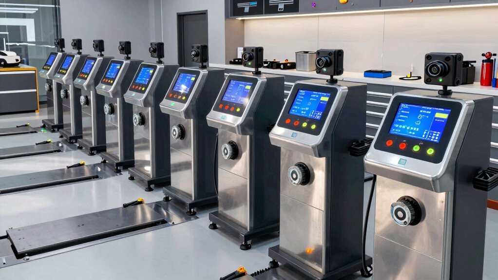 Ensuring high accuracy and precision in a wheel balancer is vital for ideal performance and customer satisfaction. I look for machines with measurement tolerances of ±1 gram or less, which guarantee precise balancing every time. Features like digital LCD screens and automatic rim recognition help deliver consistent results, reducing human error. Industrial-grade sensors, such as all-in-one pressure sensors and auto-detection systems, further enhance measurement accuracy. Mechanical stability, including a sturdy frame and vibration resistance, guarantees the machine maintains its precision during operation. Calibration capabilities and self-diagnosis functions are also essential—they keep the machine accurate over time, preventing measurement drift. Prioritizing these factors ensures the balance results are reliable, leading to better wheel performance and happier customers.
